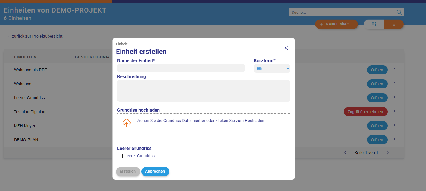 Zuerst muss ein Projekt angelegt werden. Danach kann die neue Einheit angelegt werden. Hier wird dann der Plan hochgeladen.