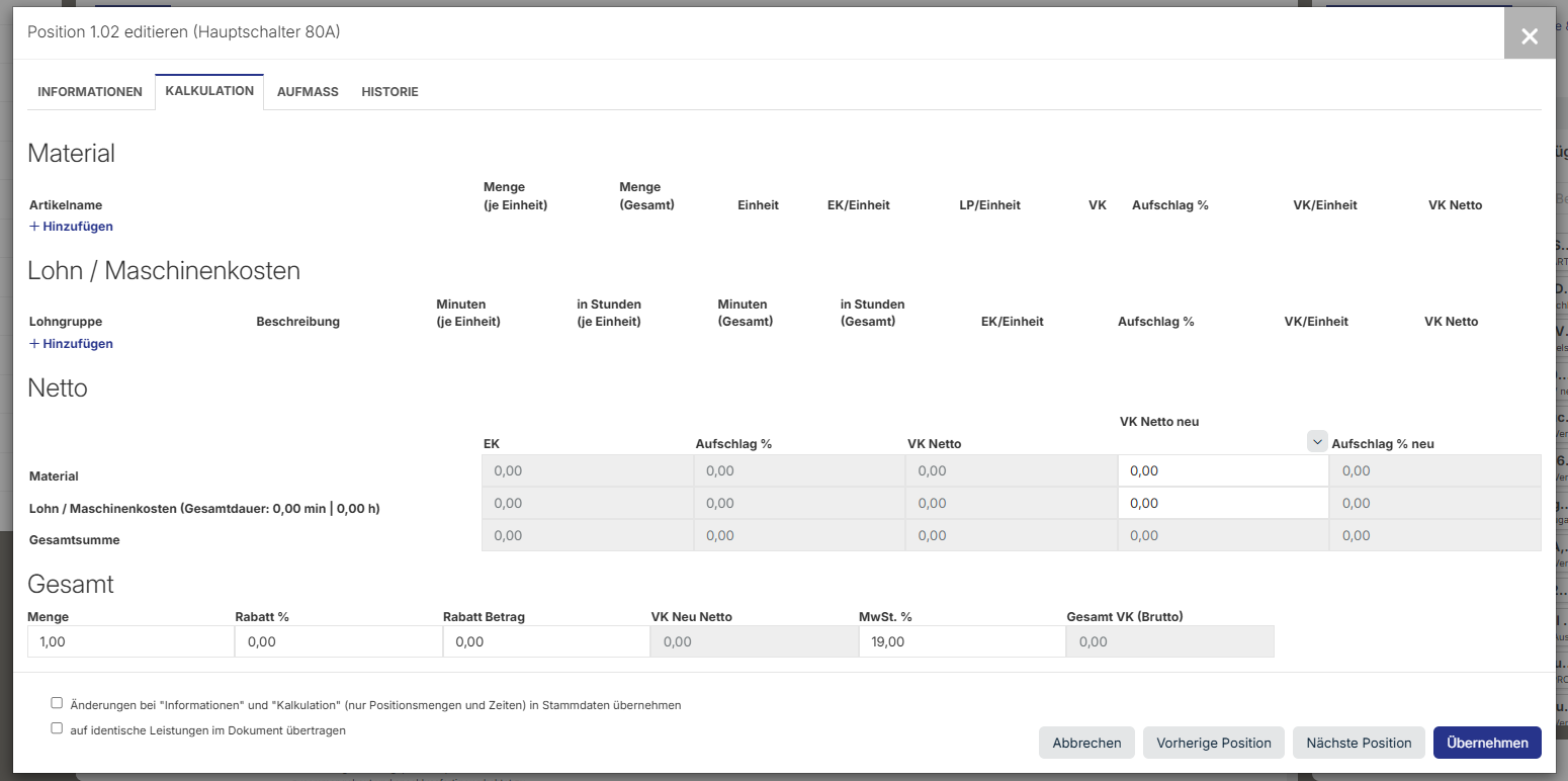 Klicken Sie dazu einfach auf das Feld für den [Einheitspreis] und es öffnet sich automatisch das Tab Kalkulation in der Detailansicht.