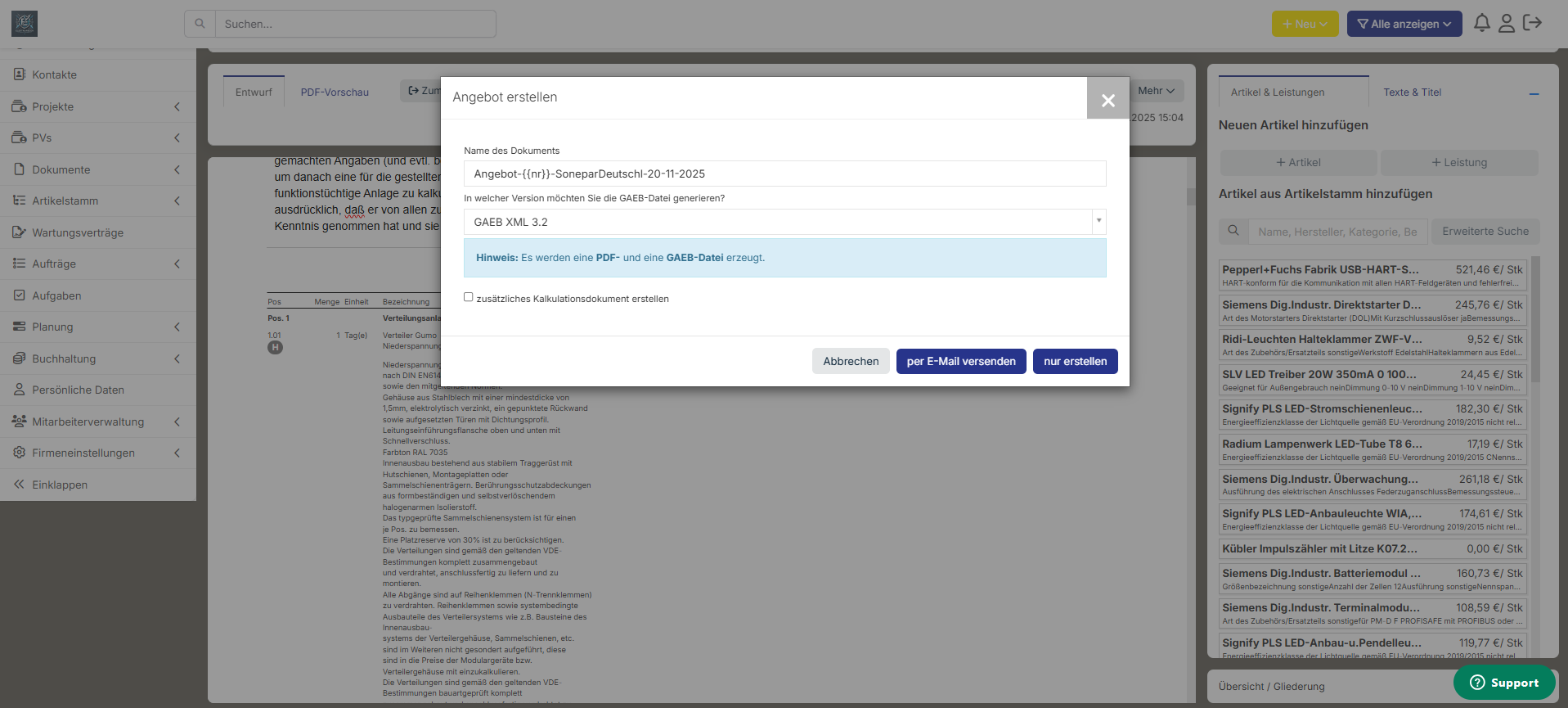 Wie bei jedem anderen Angebot in Sonepar-HERO können Sie die Dateien vorerst [nur erstellen] und ablegen oder direkt [per E-Mail] an den Auftraggeber versenden.