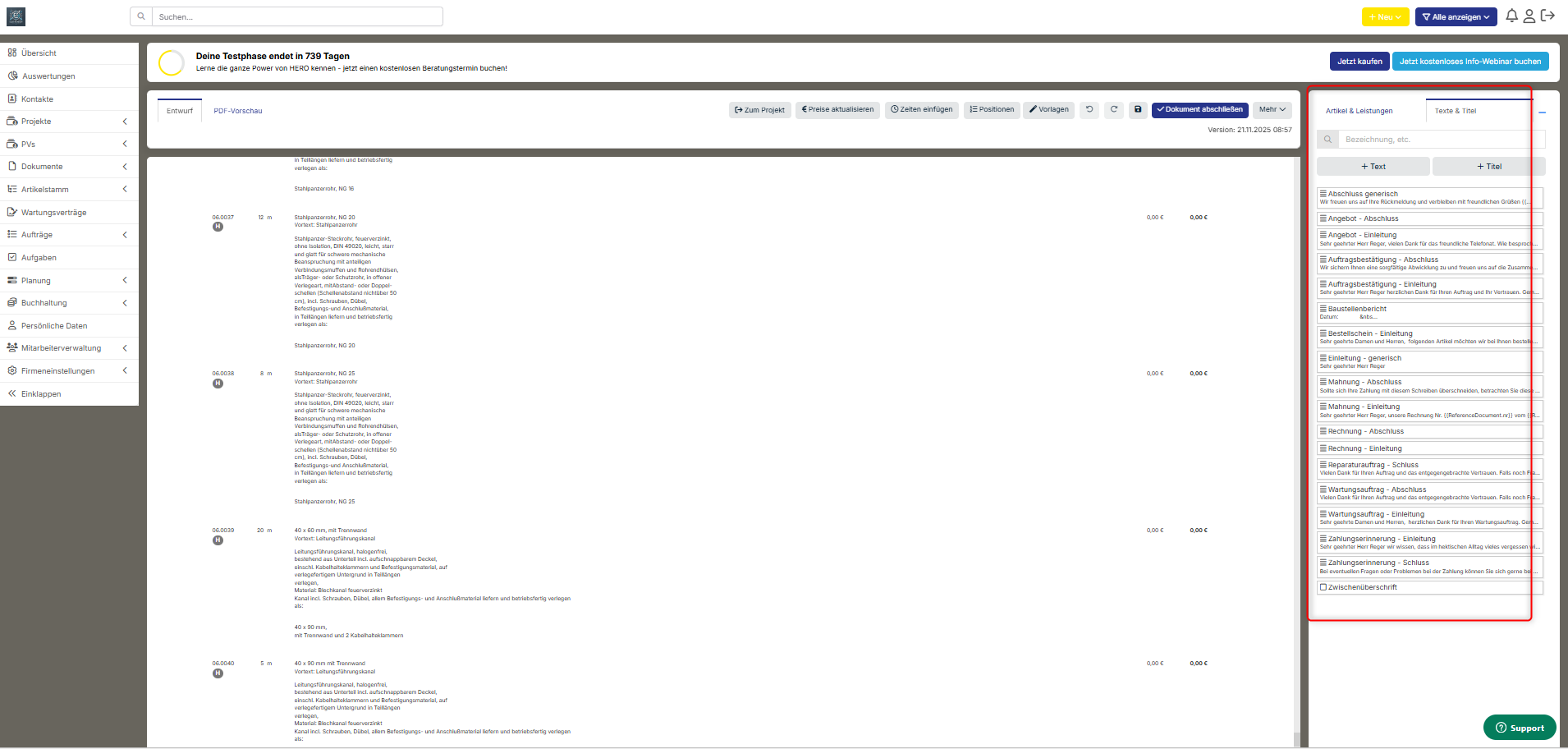 Ausführungsbeschreibungen und ergänzende Textteile werden in Sonepar-HERO in der Titelbeschreibung für den Titel, auf den sich die Beschreibungen beziehen, angezeigt. Das Leistungsverzeichnis wird durch die Darstellung in Sonepar-HERO NICHT geändert und eine gültige Angebotsabgabe (X84-Datei) kann erzeugt werden.