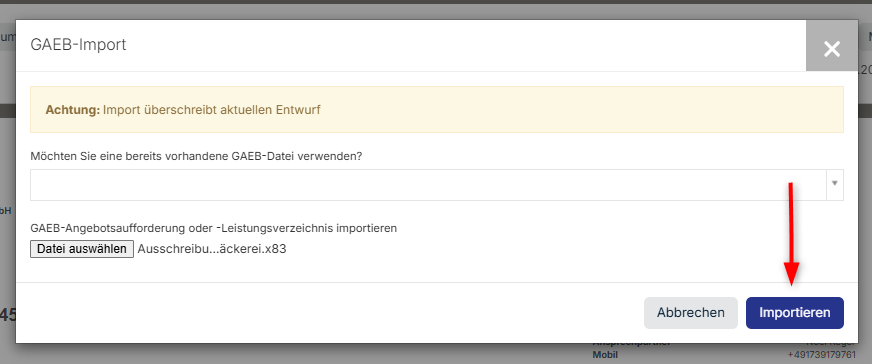Wenn Sie dies auswählen, öffnet sich ein neues Fenster, in dem Sie eine GAEB-Angebotsaufforderung (X83) hochladen können. Falls im Kontakt oder Projekt bereits GAEB-Dateien genutzt wurden, können diese im Fenster ebenfalls ausgewählt werden.