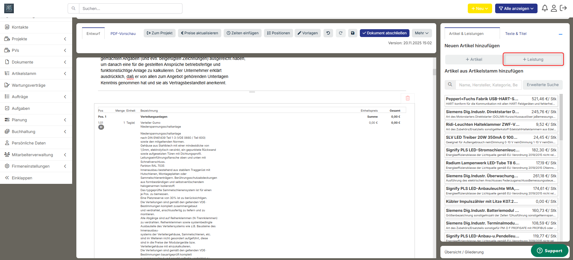Die Positionen, die durch ein GAEB Leistungsverzeichnis in Sonepar-HERO importiert werden, werden wie eine Leistung behandelt.