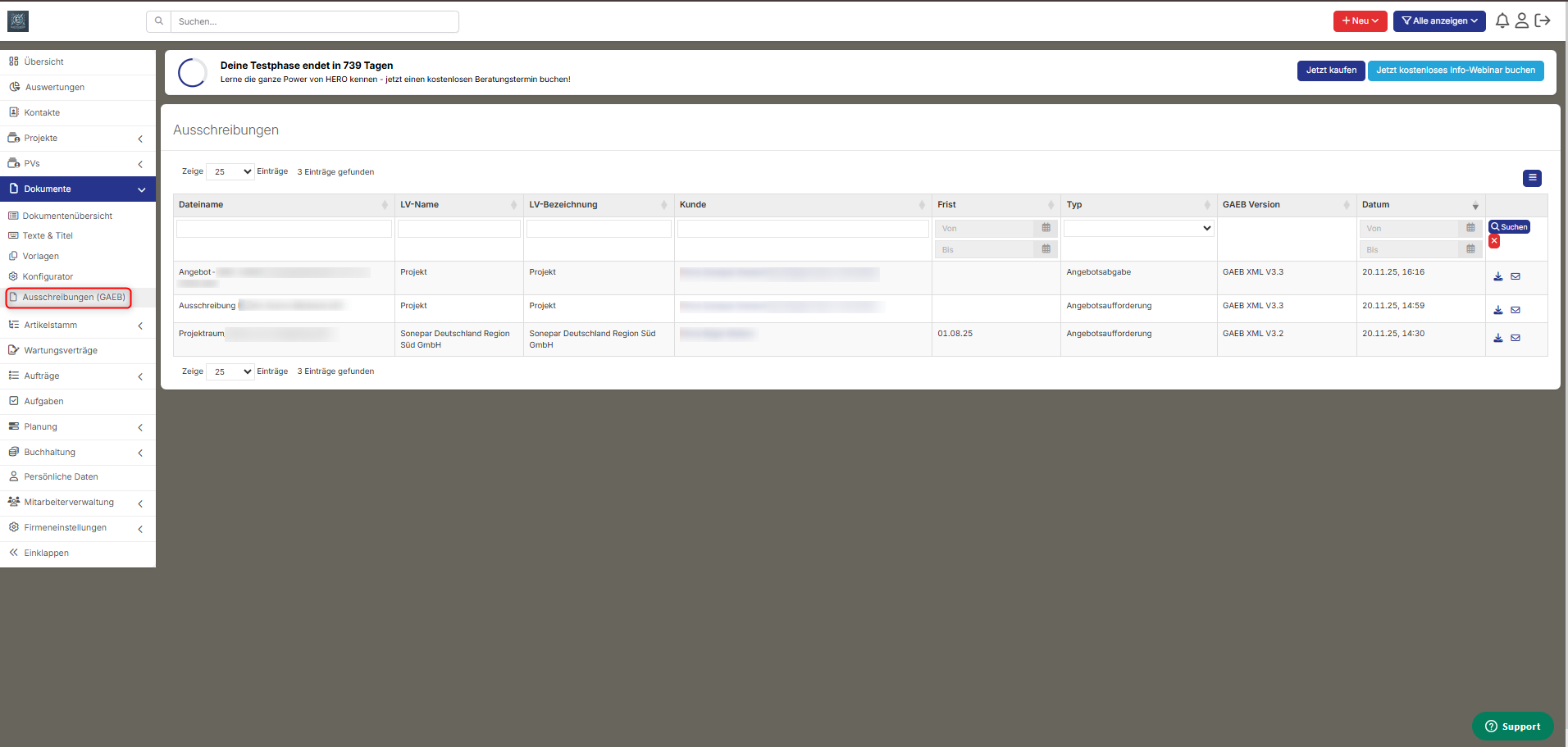 Die erstellte GAEB-84 Datei finden Sie ebenfalls unter den Projektdetails in dem Menüpunkt GAEB