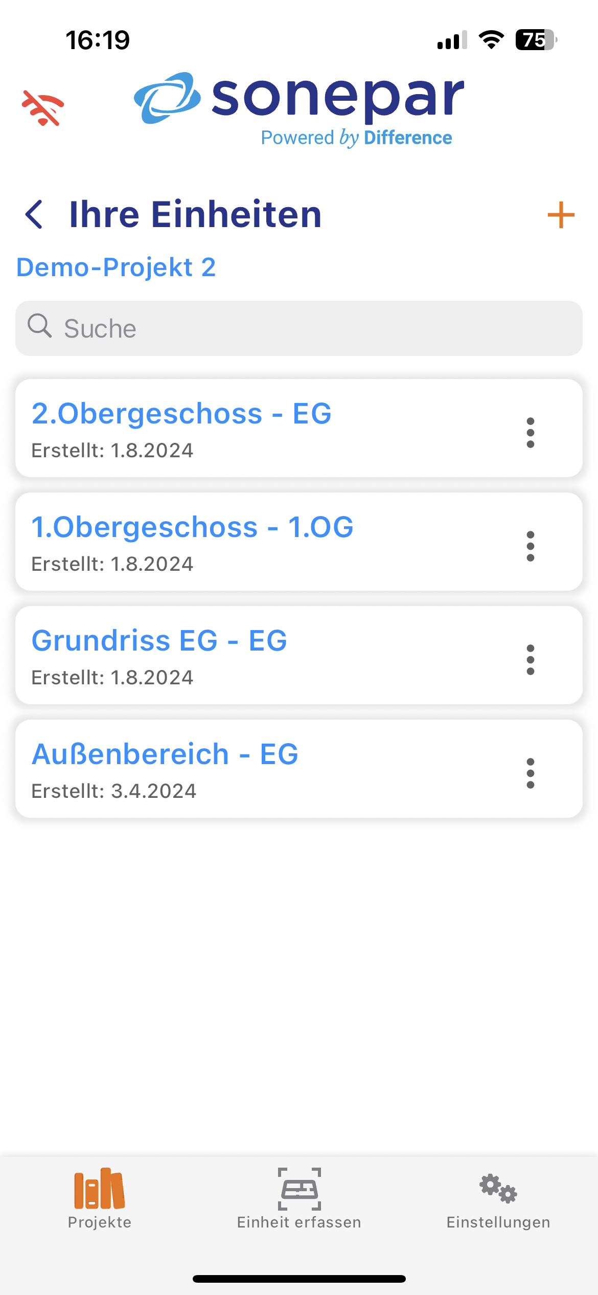 Im Bereich Projekte können Sie alle Ihre Projekte einsehen und bei Bedarf neue hinzufügen. Wählen Sie ein gewünschtes Projekt aus, um die zugehörigen Einheiten und Pläne einzusehen. Alle Einheiten, die in Sonepar-Digiplan Web erstellt wurden, werden bei bestehender Internetverbindung auch direkt in der App angezeigt und umgekehrt.