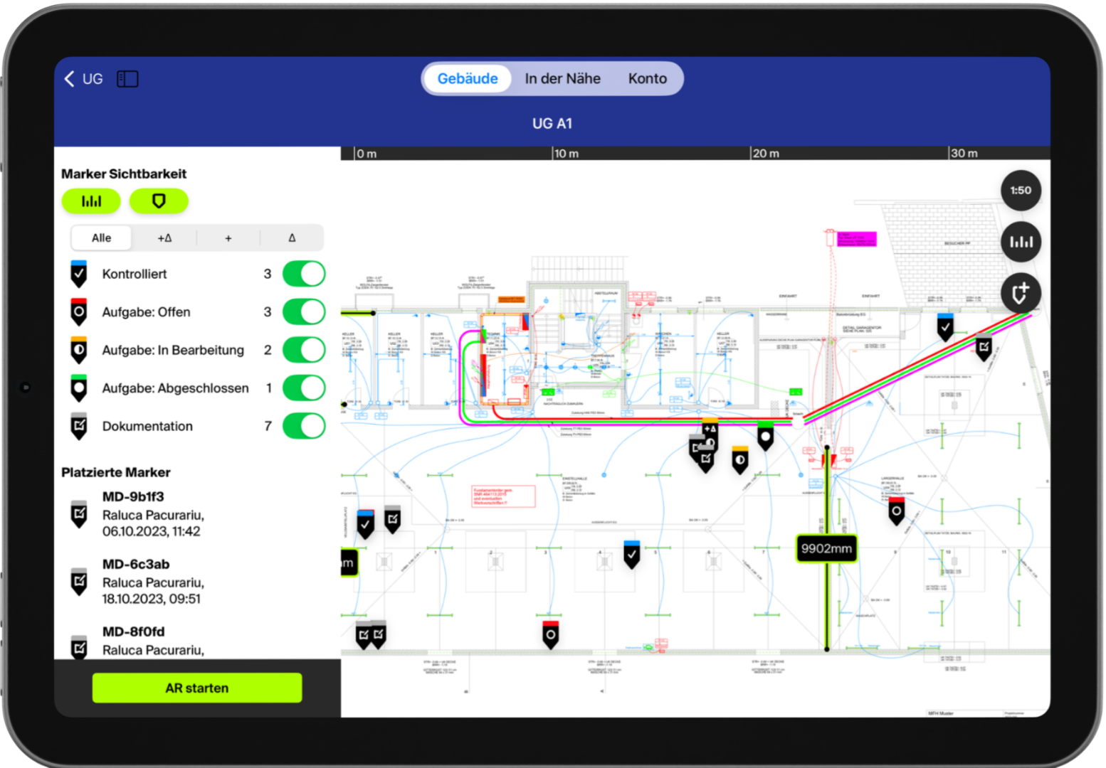 Tablets bieten eine optimale Möglichkeit, Pläne und Dateien komfortabel zu verwalten und anzuzeigen. Für Stichprobenkontrollen empfehlen wir weiterhin das Smartphone, da die AR-Technologie dort noch präzisere Ergebnisse liefert.