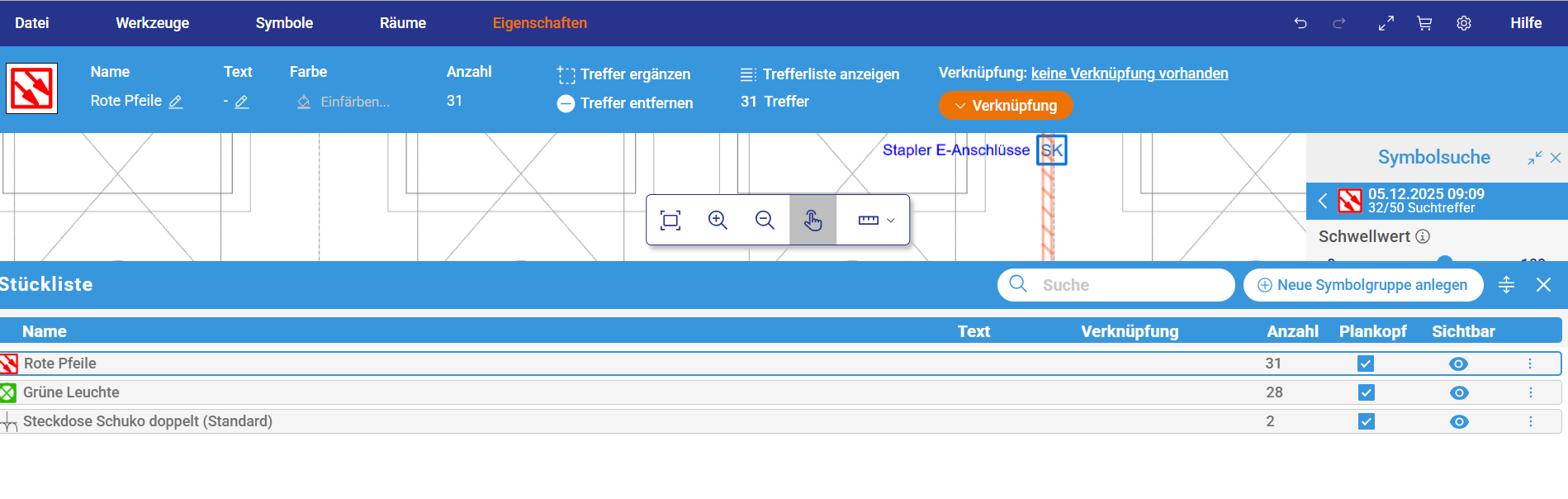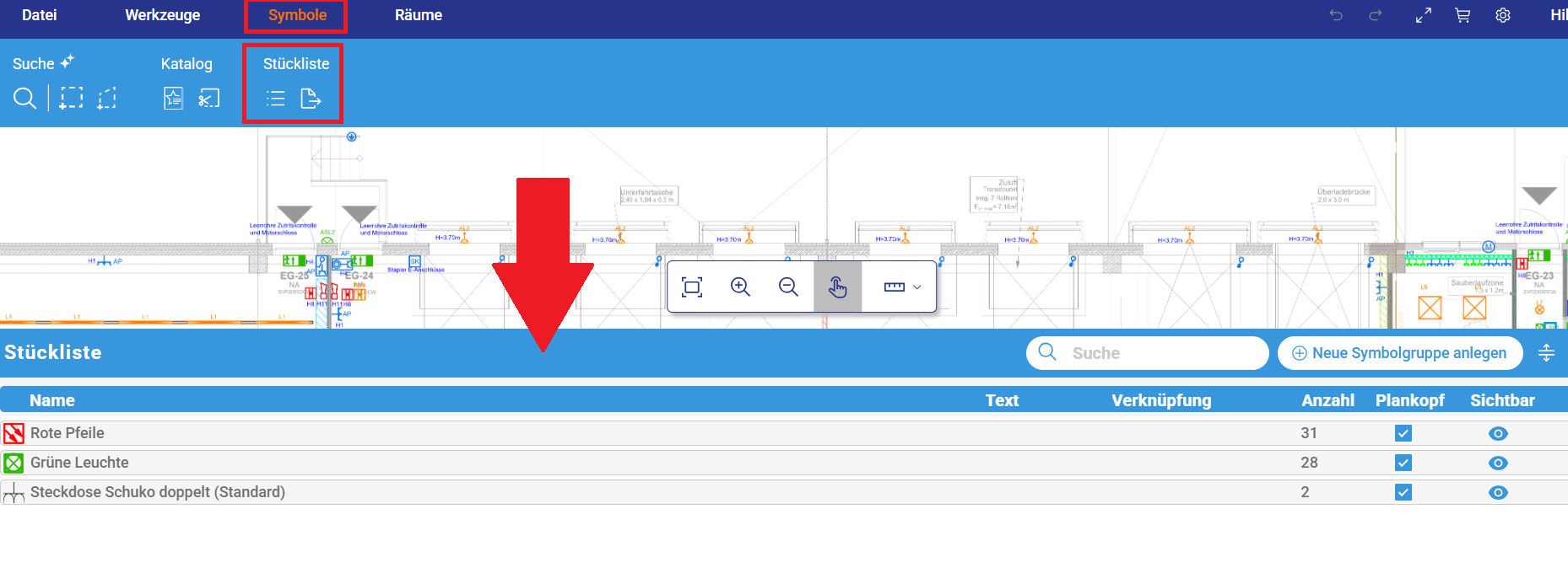 Die Stückliste, die sich auf der linken Seite befand, wurde nun unter „Symbole“ hinterlegt.