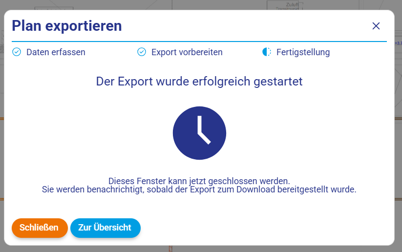 Beim Export wird nun eine Uhr statt eines grünen Hakens angezeigt → besserer Prozessindikator