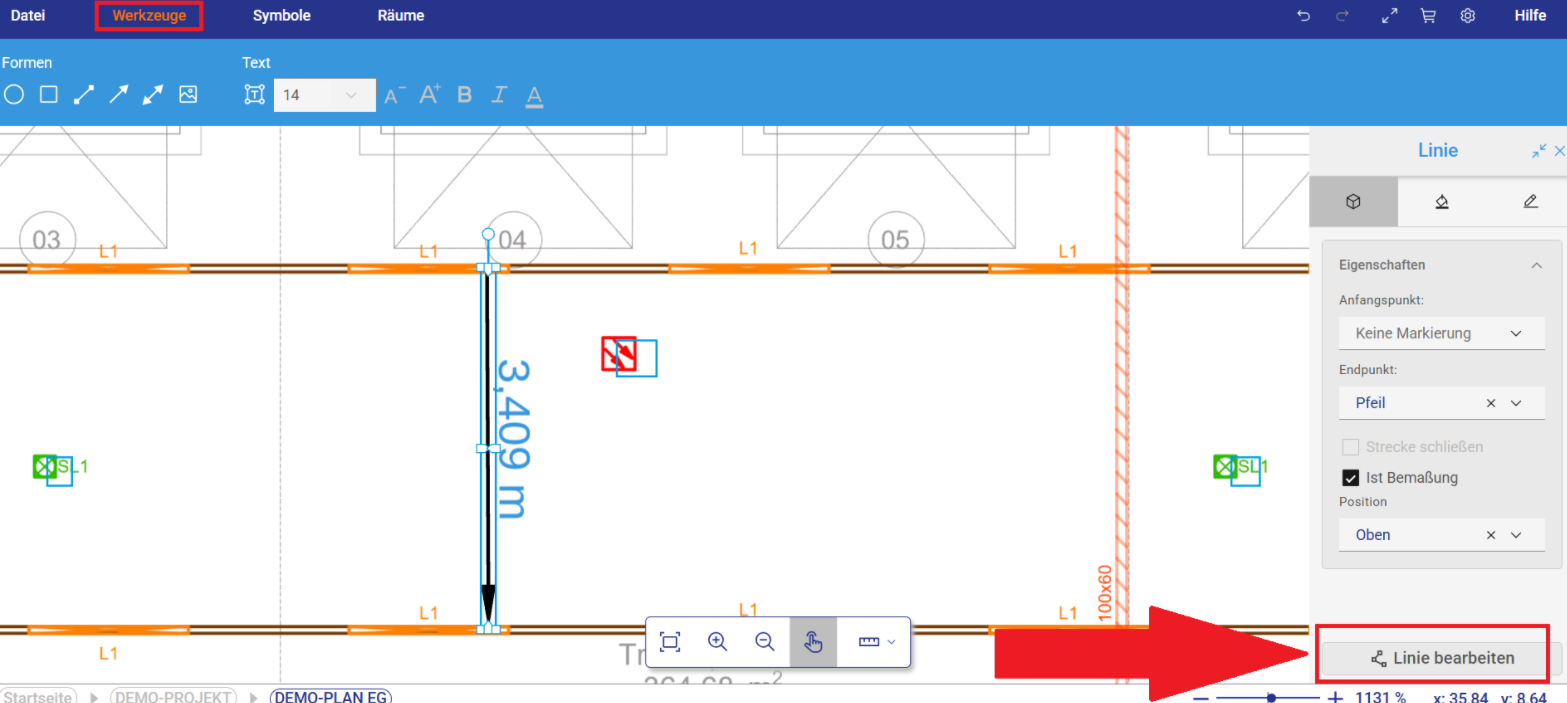 Linien wie Bemaßungen oder Pfeile können jetzt direkt bearbeitet werden. Klicken Sie einfach auf die gewünschte Linie und wählen Sie die Funktion „Linie bearbeiten“. Anschließend können Sie die Endpunkte der markierten Linie verschieben, ohne eine neue Linie einfügen zu müssen.